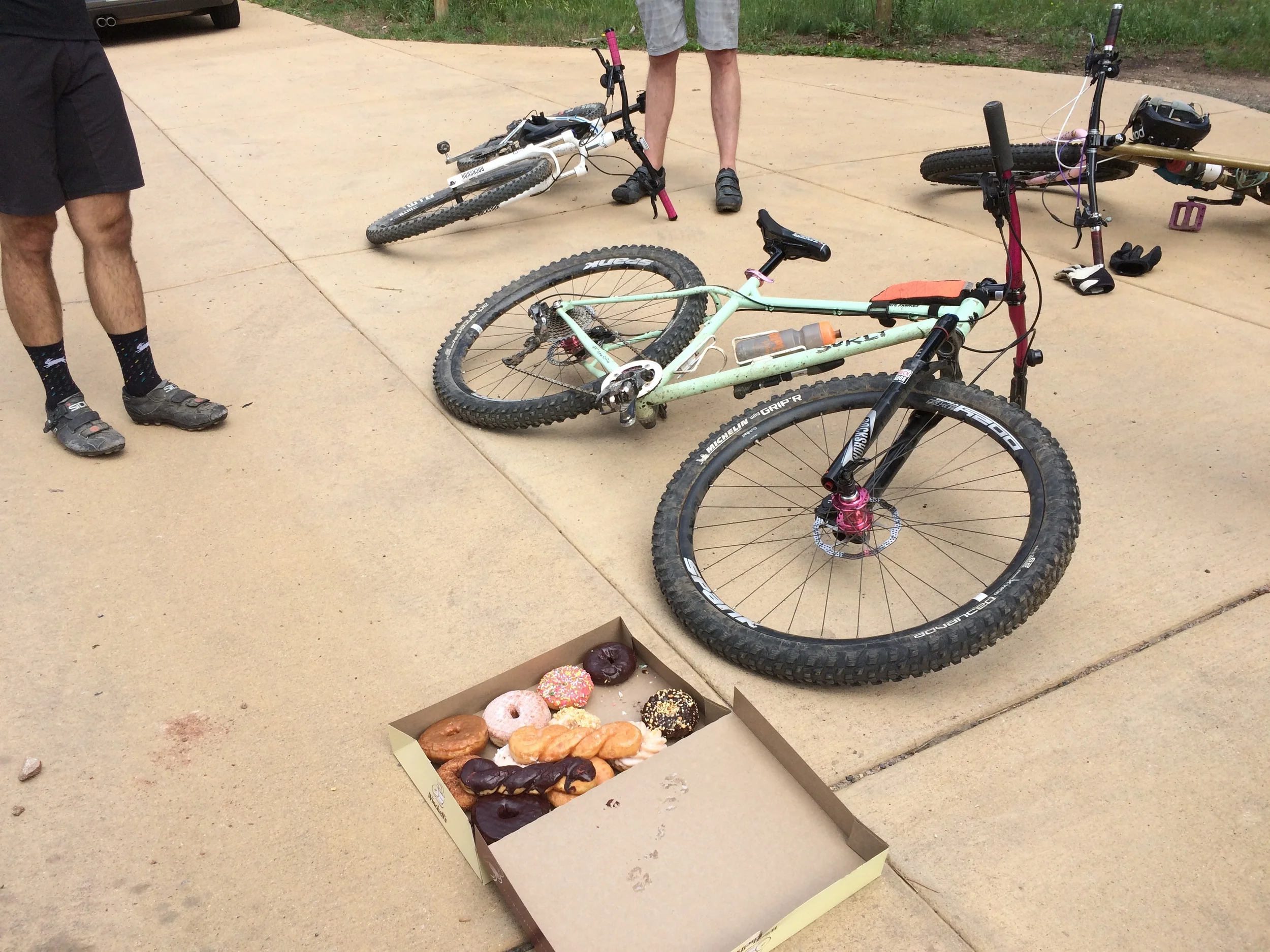 Dirt contains a natural antidepressant. The sun strengthens our bones. Mountain biking makes us happy. So do donuts. If you want to en-gooden your life, join us on Sunday mornings for some shred-tastic mountain biking and yummy donuts. Yeah! There are no trophies involved, and nobody cares if you're out of shape, hungover, or have awakened like Gregor Samsa to find you've transformed into a giant insect. Whatever. Just get your bike and come with us. Meet us at the trailhead at the specified time. The first twelve riders will get a donut. If you're the 13th person to arrive, you may have to wear the empty box as a helmet. If more than 12 people start showing up for these rides, we'll start bringing more donuts.
