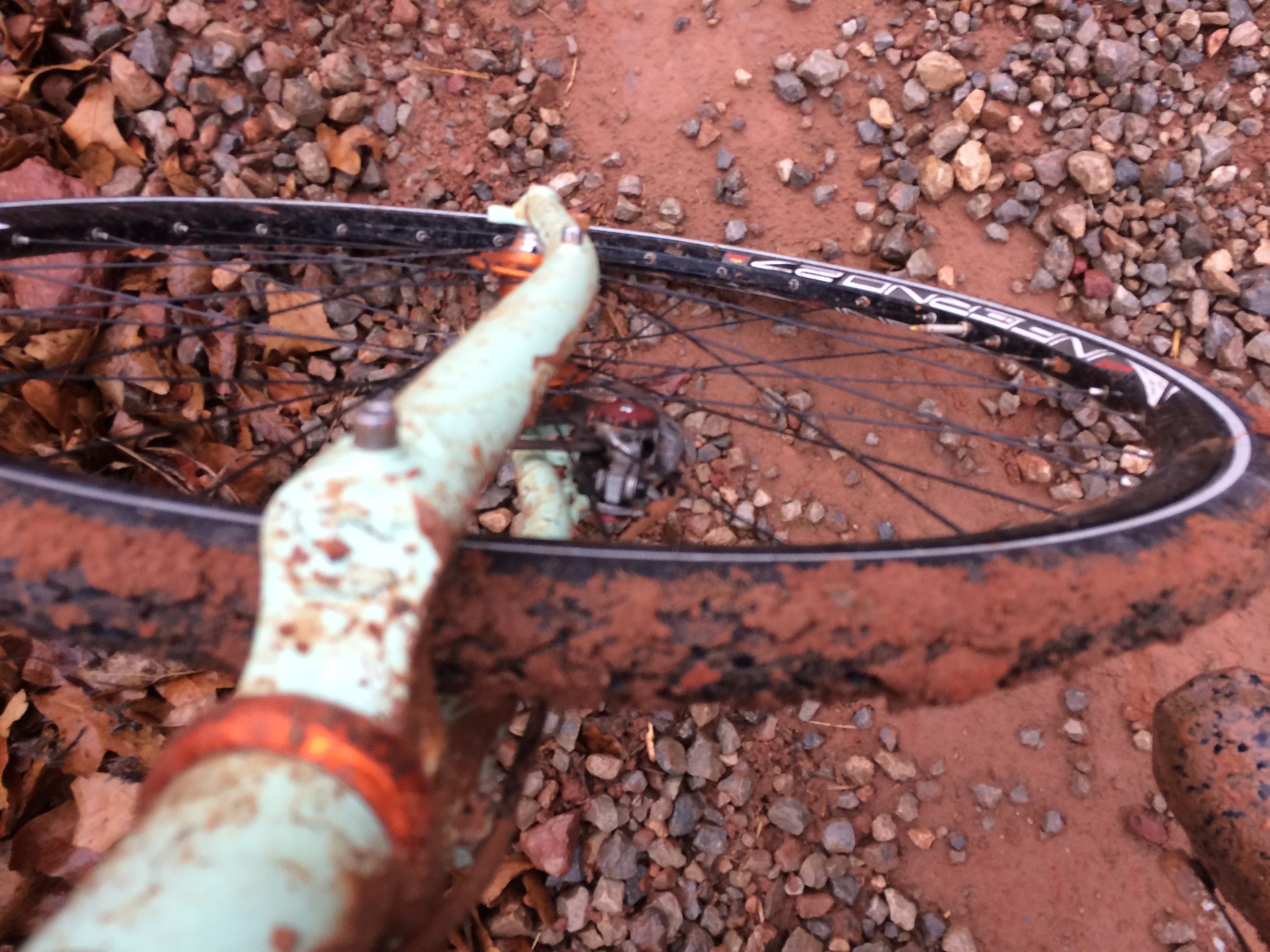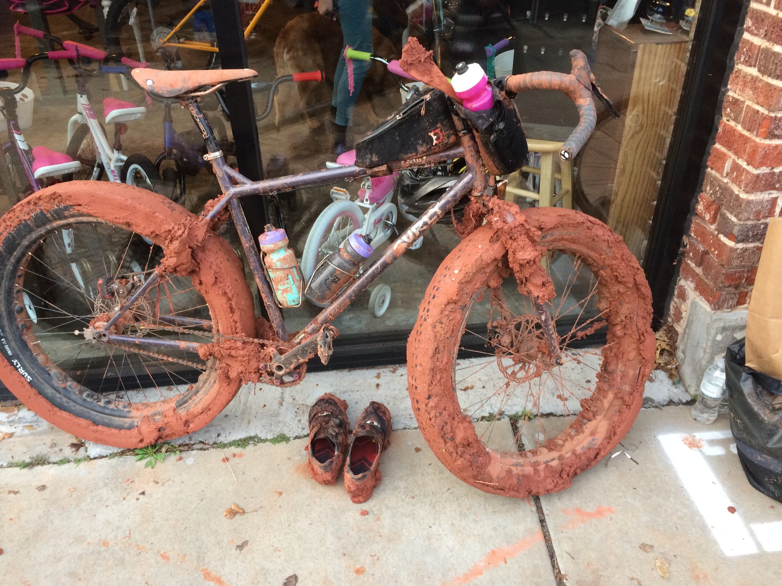 I was unable to take a lot of photographs. Initially it was too wet for me to fish my phone out of its baggie and then worm my hand back into a wet glove. Eventually I couldn't really operate my hands at all. However, this picture I took accidentally shows the benefits offered by narrow and fairly slick tires. This is about as muddy as they got.