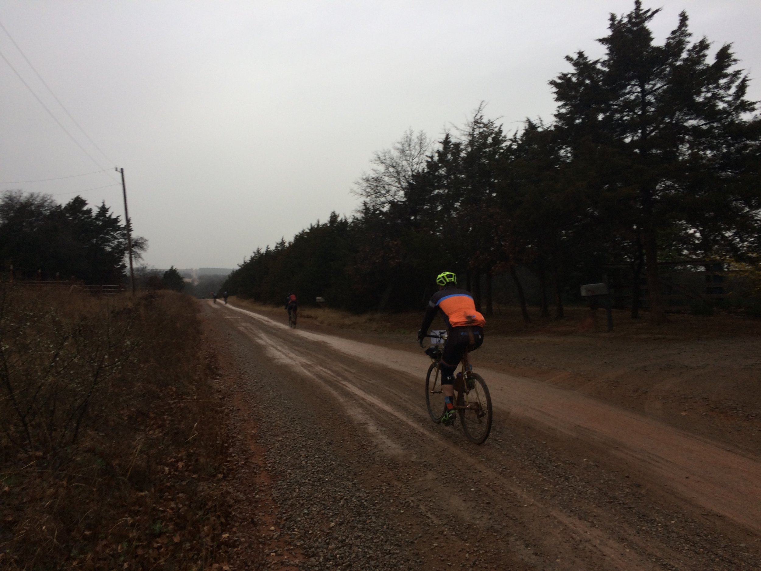 There were several miles of pavement leading into and out of Guthrie, and by the time I hit dirt again, the character of the mud had changed. It had grown mean. Ruts were deep. Clots of mud were flung by my rear wheel up over my head to rain down in front of me to be run over and flung up again.