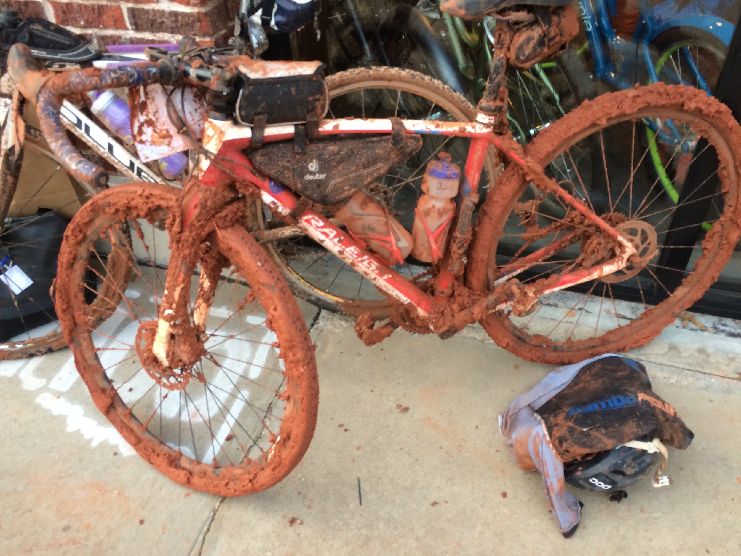 I'm guessing it was around mile twenty where we got our first real, literal taste of the terrain to come. At the crest of a hill the road turned the color of Mars, and we descended through wet cement. It was squirrelly. Climbing the subsequent roller was mixing cake batter with a bicycle. This was where I first saw a rider carrying a bike with the derailleur dangling from the chain like a pendant. I saw perhaps fifty iterations of this throughout the day.