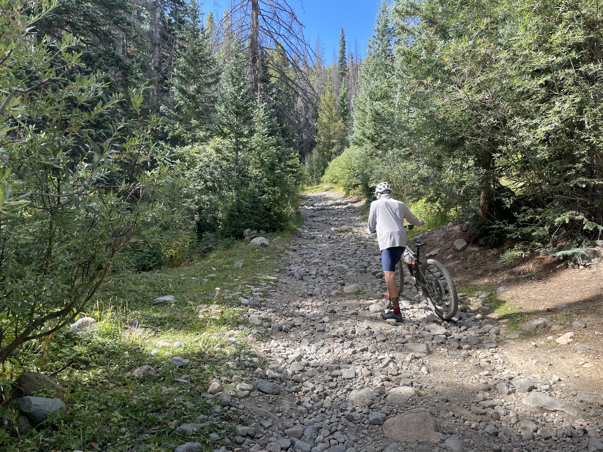 The forest through which the Vapor Trail winds is the same forest in which I grew up dinking around, with the same brisk mountain air, the same cicada chirps and coyote yaps, the same sprucey, mossy musk. The breeze sounds familiar moving through these aspen leaves and pine needles. The ride is by turns quite pleasant and brutally difficult. But who cares. We all face hard things, and in the end this is just a bike ride.
