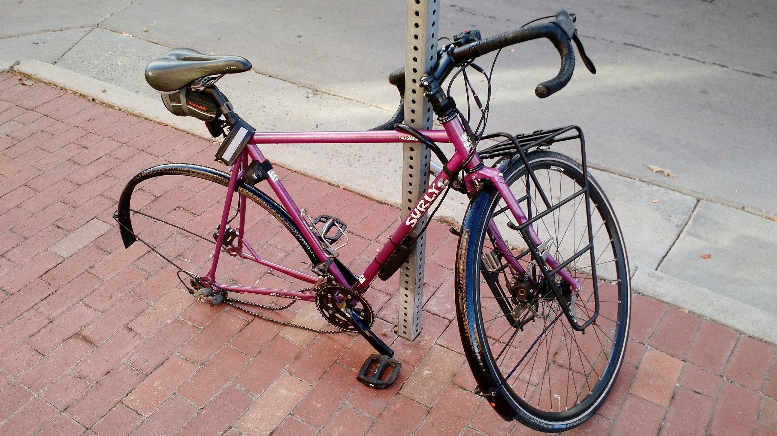 "Glitter Dreams Surly Straggler turned sinister commuter with Gevenalle shifters, Velo Orange fenders, Schwalbe 700c Marathons, Surly front rack, squishy Serfas saddle, flat pedals, Cygolite tail- and Niterider head-light, and some cages for water cups from Illegal Pete's. Plus a saddlebag with repair/spare items and a U-lock mounted to the seat tube...about that U-lock.